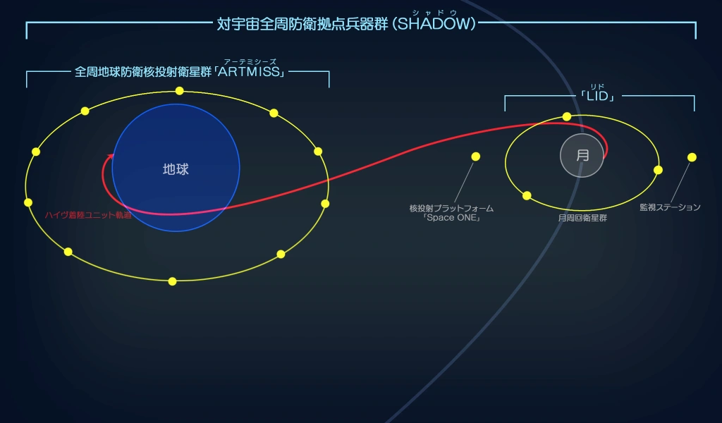 The LID system handles all of the organized satellites and detection networks focused on observing the lunar surface and orbit for BETA activity. The primary defense satellite used for early interception is called Space One, and is the largest satellite in LID. For surveillance, there are at least three satellites in low orbit of the Moon at all times, with a fourth one sharing the same orbit as Space One that acts as the primary collector and transmitter of data.